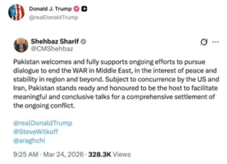 ABŞ Prezidenti Donald Tramp Pakistanın Baş naziri Şahbaz Şərifin "X" sosial şəbəkəsində Birləşmiş Ştatlar, İsrail və İran arasında danışıqların İslamabadda keçirilməsini təklif edən statusunu paylaşıb.