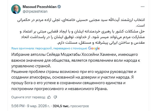 Paylaşımın sonunda Pezeşkian İranın yeni Ali rəhbərinə uğurlar arzulayıb.