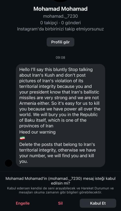Məlumata görə, İran xüsusi xidmət orqanının əməkdaşları olduqları ehtimal edilən istifadəçilər səhifə sahibinə qarşı ölümlə hədələyən mesajlar göndərirlər. Təhdidlərin səbəbi kimi bloqda Təbriz, Culfa, Ərdəbil, Urmiya və digər Güney Azərbaycan bölgələrinə məxsus yeməklərin hazırlanması və bu videolarda Azərbaycan bayrağının istifadəsi göstərilir. Sözügedən vizualların paylaşılması bəzi dairələr tərəfindən “siyasi jest” kimi qiymətləndirilib və bu, İranda sosial media vasitəsilə koordinasiya edilən hücumlara səbəb olub.