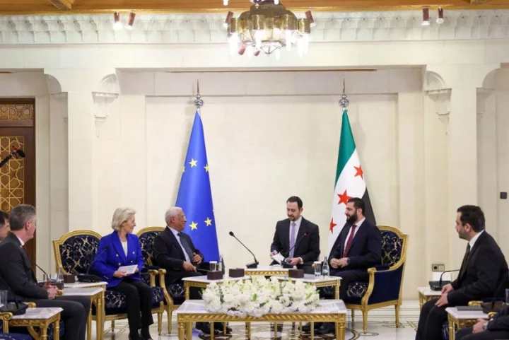 Avropa İttifaqı (Aİ) Şurasının sədri Antoniu Koşta və Avropa Komissiyasının sədri Ursula fon der Lyayen Dəməşqdə Suriya Prezidenti Əhməd əl-Şaraa ilə görüşüblər.